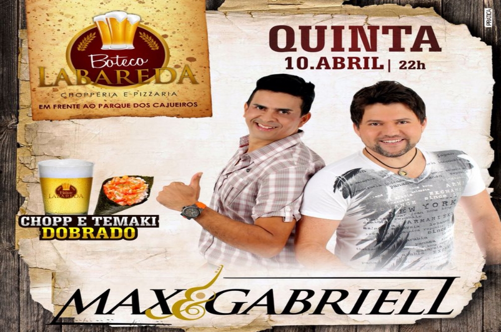 A “Quinta Top” do Boteco Labareda terá o super show da dupla Max & Gabriell. Nesse dia casa oferece chopp e temaki dobrado. A festa começa a partir das 22h e casa está localizada na avenida Beira Mar, em frente ao Parque dos Cajueiros.