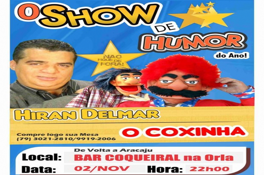 Hiran Delmar, um dos humoristas de maior repercussão nacional, com mais de 20 anos de carreira e sucesso com mais de 50 personagens, vai estar de volta a Aracaju, neste sábado, 2, no Bar Coqueiral na Passarela do Caranguejo na Orla de Aracaju. O show incluiu piadas e interpretações de personagens famosos como: O Coxinha, Bebel do Jereisaati, Bia Sflait e outros que o programa Autarquias do Humor no rádio e na TV.