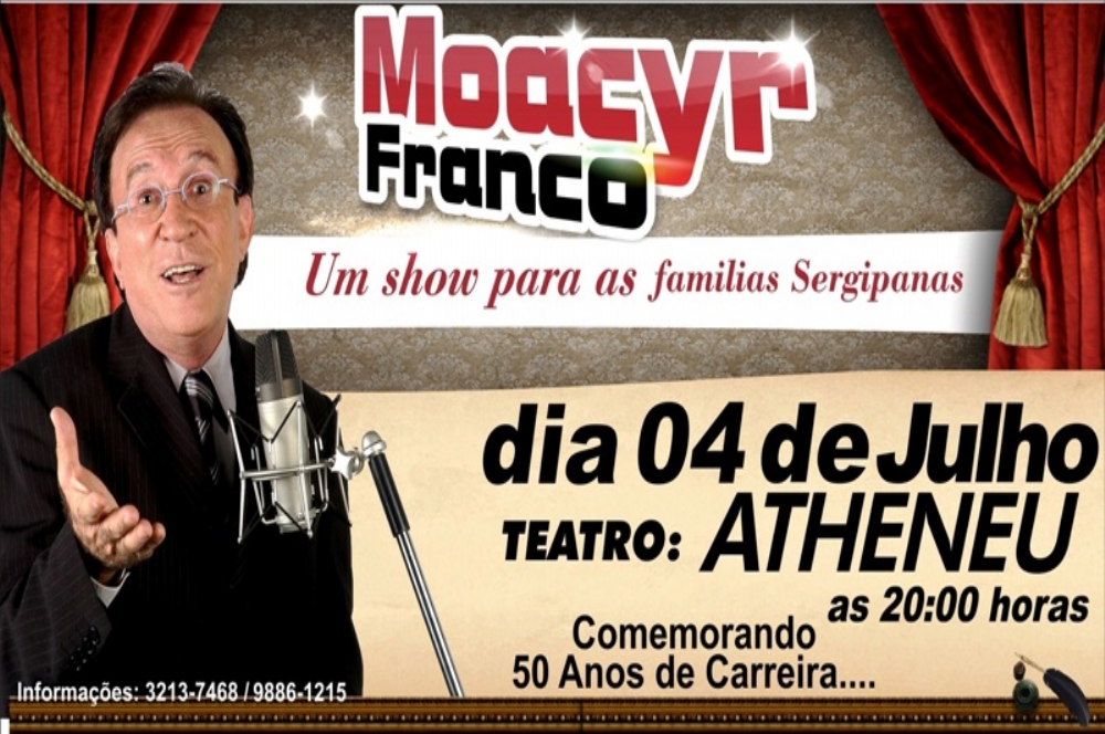 Criar, inovar e transformar. Esse é o lema de Moacyr Franco. Na música, depois de ser considerado o maior cantor e compositor de músicas, sertaneja, romântica, carnavalesca e infantil, surpreende em 2004 com o rock, “Tudo Vira Bosta” gravado por Rita Lee é tema da novela “Senhora do Destino” da Rede Globo. Em Aracaju, Moacyr Franco faz show no dia 21 de julho, a partir das 20h, no Teatro Atheneu.