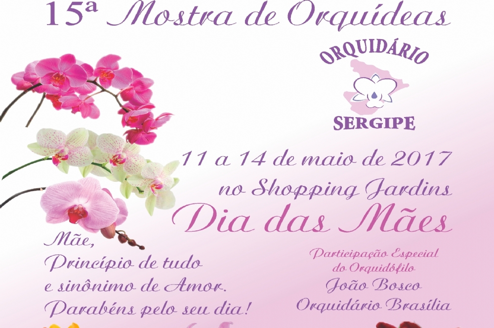 O Orquidário de Sergipe realiza entre os dias 11 e 15 de maio, a 15ª Mostra de Orquídeas. O evento acontece no Shopping Jardins. Com o tema ‘Mãe, princípio de tudo e sinônimo de amor’, o evento acontece anualmente em homenagem às mães. A 15ª edição contará com a participação especial do Orquidófilo João Bosco, que atua no Orquidário Brasília.