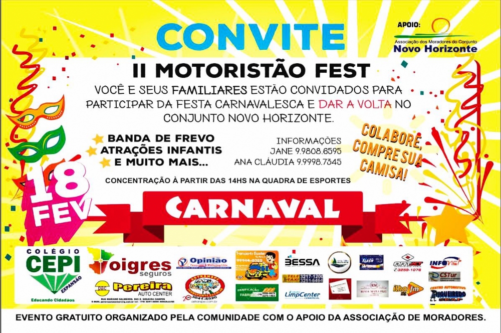 O carnaval está chegando e para os foliões que querem aproveitar o período carnavalesco ao lado da família, uma excelente opção é o II Motoristão Fest, festividade carnavalesca que contará com a presença de toda a comunidade do conjunto Novo Horizonte para curtir um carnaval de rua ordeiro é familiar.
