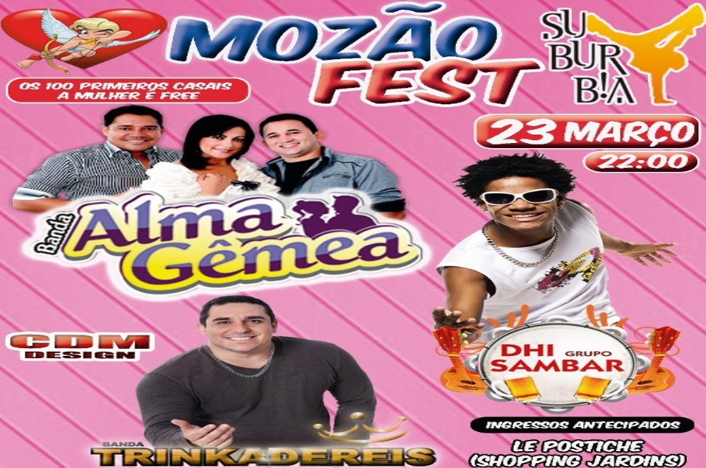 A edição 2013 do Mozão Fest traz como atrações principais as bandas Alma Gêmea, Dhi Sambar e Trinka de Reis. A Casa de show Suburbia recebe o evento que será realizado no dia 23 de março, a partir das 22h. O destaque vai para os 100 primeiros casais, já que a mulherada que estiver acompanhada terá entrada liberada.