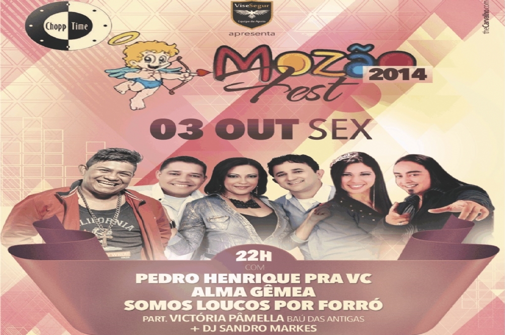 A edição 2014 do Mozão Fest já tem dia, hora e local marcados. A festa acontece no dia 3 de outubro, a partir das 22h, no Chopp Time, com Pedro Henrique Pra Vc, Alma Gêmea, Somos Loucos por Forró e participação especial da cantora Victória Pâmella (Baú das Antigas) e do DJ Sandro Markes. Participe da promoção do Portal Infonet e concorra a ingresso.
