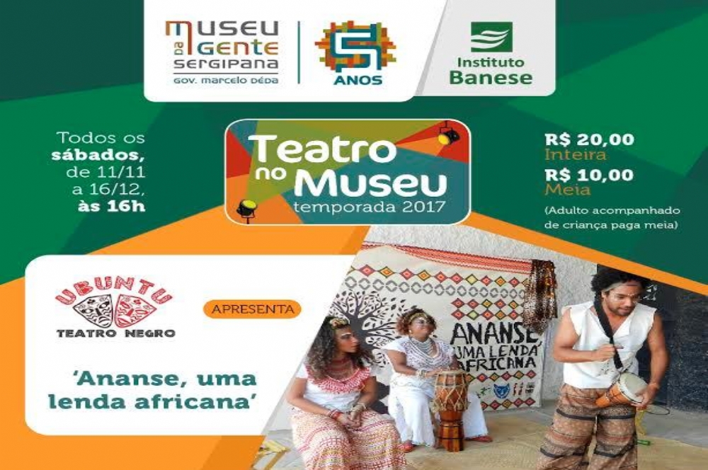 No próximo sábado, 11, o Teatro no Museu receberá o espetáculo ‘Ananse, uma lenda africana’, que ficará em cartaz até o dia 16 de dezembro, encerrando a temporada 2017 do projeto. O Teatro no Museu tem como objetivo abrir espaço para projetos de artes cênicas direcionados a crianças, adolescentes e toda família, fomentar a produção artística local e a formação de plateia. Esse ano, a iniciativa do Instituto Banese, através do Museu da Gente Sergipana Gov. Marcelo Déda, conta com a parceria das Companhias Ponto de Teatro, Os Tripulantes, Catalise, Cígari, Ubuntu – Teatro Negro, Cia. dos Sonhos e do contador de histórias Luciano Góis.