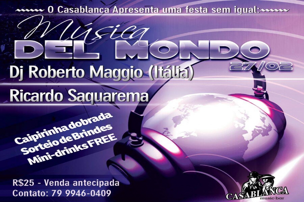 O Casablanca Music Bar tem o prazer de apresentar Ricardo Saquarema e DJ Roberto Maggio diretamente da Itália para trazer uma mistura de ritmos de lugares e origens diferentes! Serão duas super atrações, com sorteio de brindes, caipirinha dobrada e Mini-drinks FREE! O evento acontece na quinta-feira, dia 27 de Fevereiro, às 22h. Ingressos ao valor de R$25 (antecipado). Informações através de (79) 9946-0409.