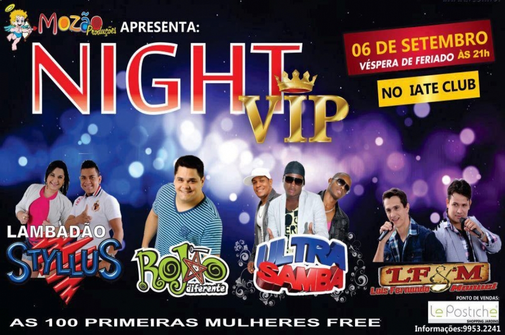 Se você ainda está pensando no jeito ideal de celebrar o feriadão, seus problemas acabaram. A véspera do feriado da Independência já tem farra e diversão garantida: Night Vip. A festa que será realizada no Iate Clube, a partir das 21h, terá como atrações Rojão Diferente, Lambadão Styllus, Ultra Samba e Luiz Fernando & Manuel.