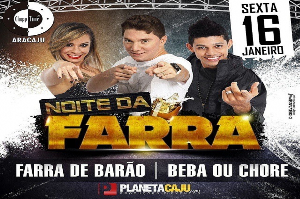 As bandas Farra de Barão e Beba ou Chore são as atrações da Noite da Farra que acontece nesta sexta-feira, 16, a partir das 22h, no Chopp Time, localizado na Rua Alferes José Pedro de Brito, n. 1170, próximo ao farol da Unit. Ingressos disponíveis na portaria do evento.