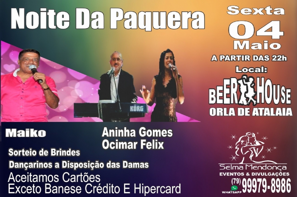 O Beer House promove na sexta-feira, 4 de maio, a Noite da Paquera. Maiko, Aninha Gomes e Ocimar Felix vão comandar a festa. Os ingressos individuais custam R$ 25. O evento contará com sorteios de brindes e dançarinos. O Beer House fica na Orla de Atalaia. Informações podem ser obtidas por meio telefone (79) 99979 8986.