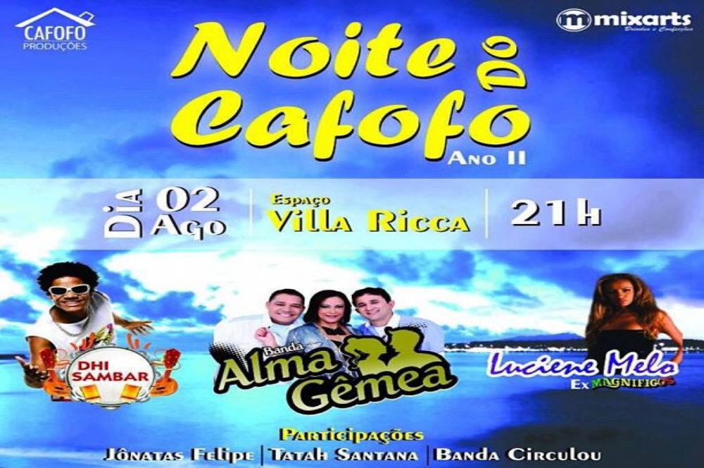 No dia 2 de agosto, as bandas DhiSambar, Alma Gêmea e Luciene Melo, ex- vocalista da Magníficos, comandarão a festa “Noite do Cafofo”, o evento contará ainda com as participações de Jônatas Felipe, Tatah Santana, Maysa Reis, Tuka Velloz e a Banda Circulou, no Espaço Villa Ricca, a partir das 21h. Os ingressos estão sendo vendidos a preço promocional na Escariz (shopping Jardins).