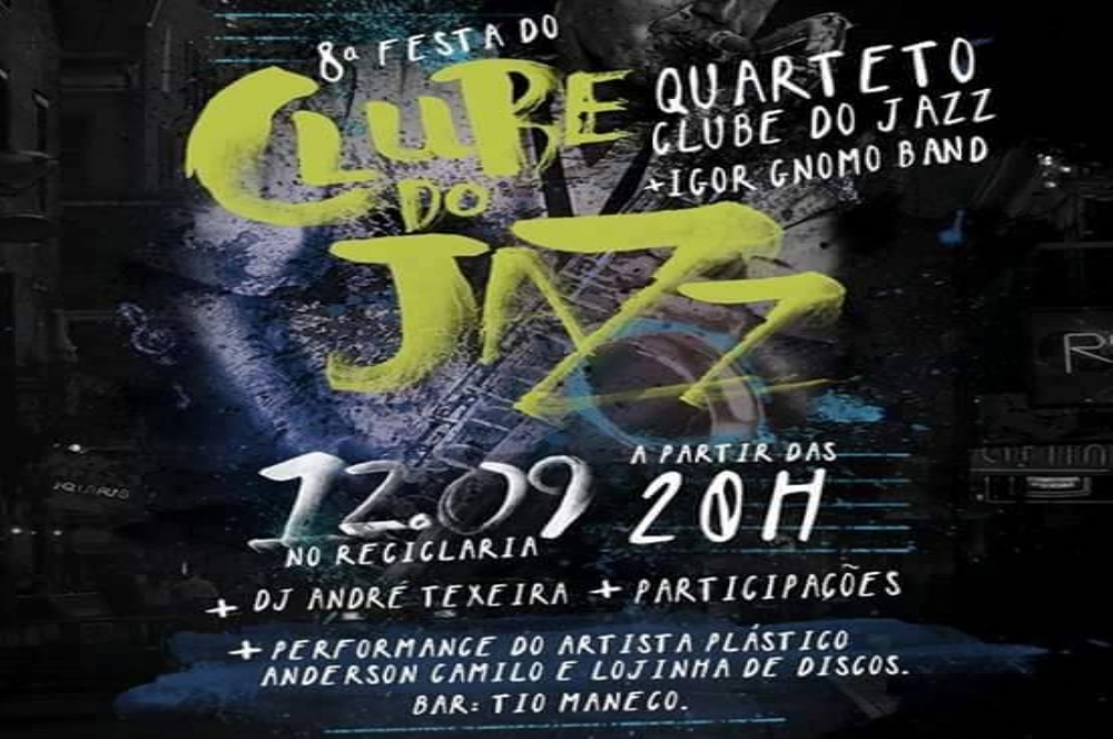 O Clube do Jazz chega ao oitavo evento, desta vez tomando proporções maiores. No dia 12 de setembro, faremos uma festa regada a muito jazz na Reciclaria, às 20h. A noite contará coma apresentação de Igor Gnomo Band, artista que é graduando em licenciatura em música (UFS) e ganhou seu primeiro instrumento aos oito anos de idade. Em dezembro de 2011 lançou o seu primeiro CD instrumental intitulado “NorDestino”, que apresenta nove composições de sua autoria, passando pelo rock, fusion, baião e jazz.