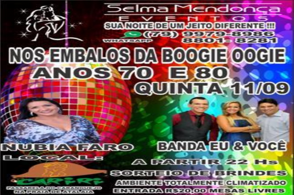 Nos embalos de Boogie Oogie – anos 70 e 80 acontece nesta quinta-feira, 11, com Núbia Faro e Banda Eu & Você. Será a partir das 22h, no Cariri. Os ingressos custam R$ 20. Informações através dos telefones (79) 9979 8986 e 8801 8281.