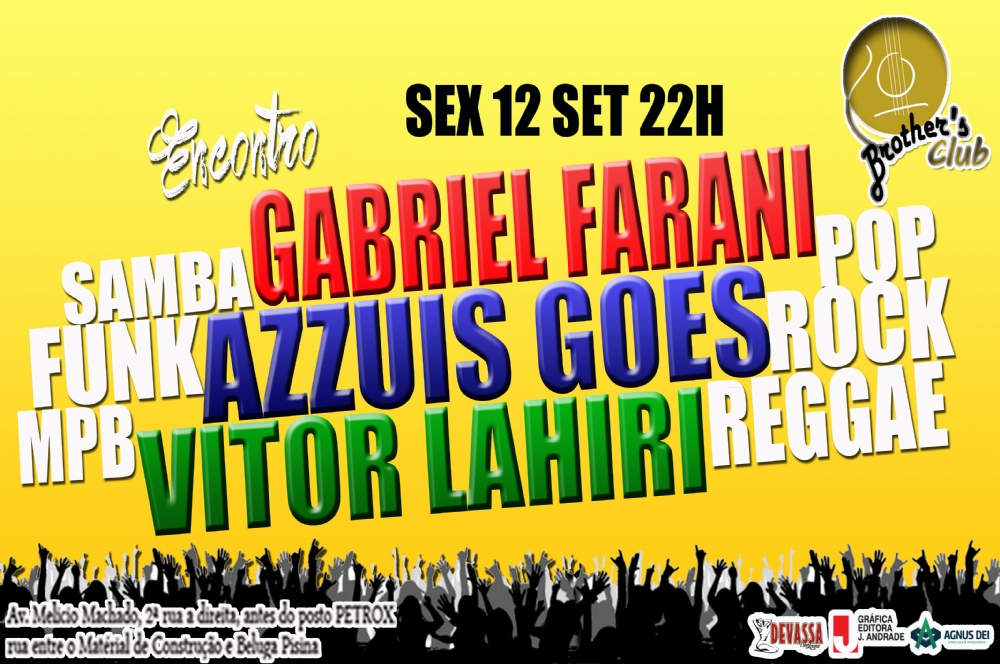 Azzuis Goes, Gabriel Farani e Vitor Lahiri comandam nesta sexta-feira, 12, o Grande Encontro do Brother’s Club. No repertório, pop, rock, samba, funk, MPB e reggae. Informações através do telefone (79) 9988 1922.