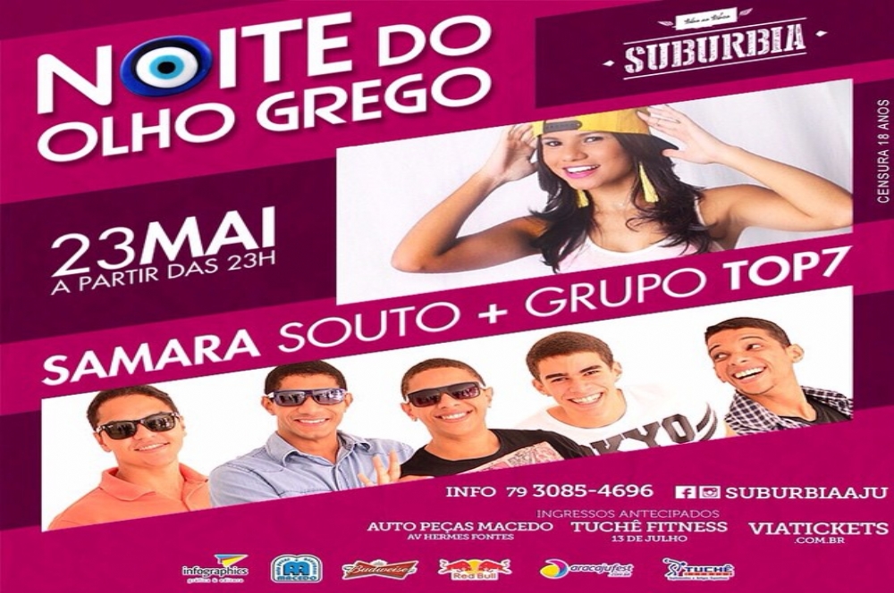 A talentosa Samara Souto está preparada pra espantar as energias ruins neste sábado, 23, na casa de todas as tribos, Subúrbia. Ao lado da banda Top7, a cantora comanda a Noite do Olho Grego, que promete ser surpreendente. Ingressos a R$25 na Auto Peças Macedo (Hermes Fontes) e Tuchê Fitnees (13 de Julho).