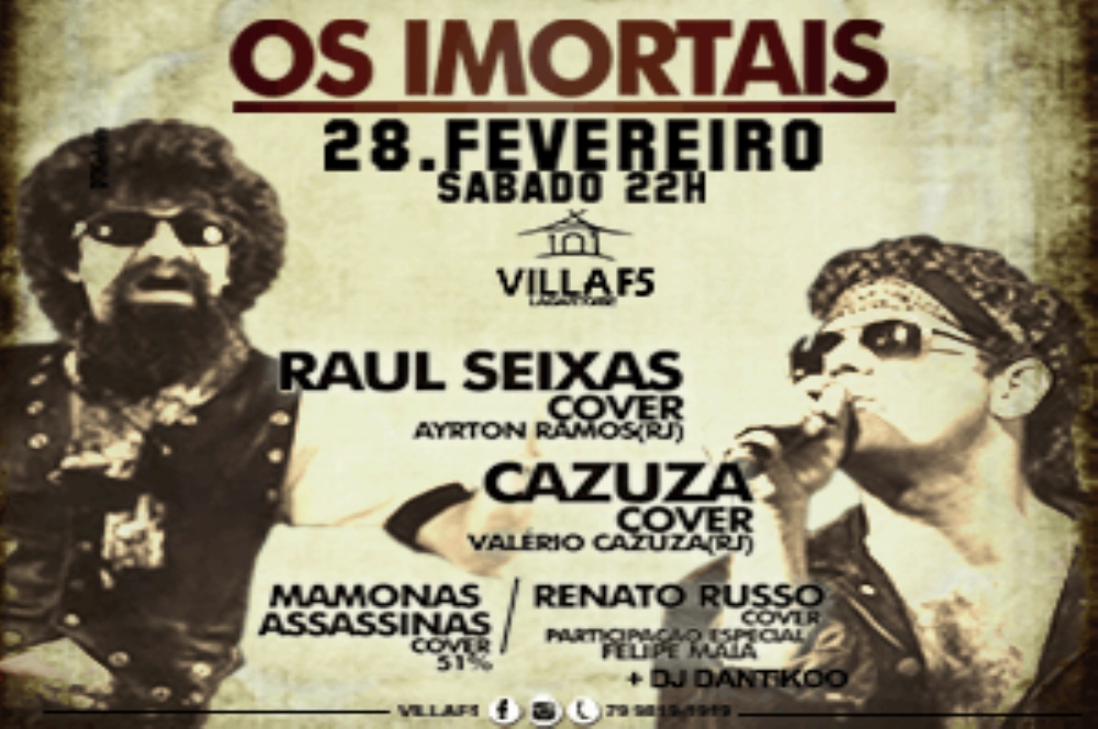No dia 28 de fevereiro, o Villa F5 receberá o primeiro encontro de covers de mitos que marcaram época e até hoje se propagam através de suas canções. O evento “Os Imortais” reunirá os covers de Cazuza, Raul Seixas, Mamonas Assassinas e ainda Renato Russo. Participe da promoção do Portal Infonet e concorra a ingresso.