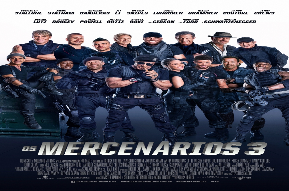 (The Expendables 3). EUA, 2013. Direção de Patrick Hughes. Roteiro de Sylvester Stallone, Creighton Rothenberer, Katrin Benedict, baseado nos personagens criados por David Callahan. Produção de Avi Lerner, Kevin King Templeton, Danny Lerner, Les Weldon, John Thomson. Direção de Fotografia: Peter Menzies Jr. Edição de Sean Albertson, Paul Harb. Música de Brian Tyler, com supervisão de Selena Arizanovic. Deenho de Produção: Daniel T. Dorrance. Direção de Arte: Ivan Ranghelov. 127m, 14 anos. Cia Produtora: Lionsgate Prooduction, Millennium Films, Nu Image Production. Distr. No Brasil: California Filmes. Com Sylvester Stallone, Jason Statham, Arnold Schwarzenegger, Antonio Banderas, jet Li, Wesley Snipes, Dolph Lundgren, Kelsey Grammer, Mel Gibson, Harrison Ford, Kellan Lutz, Randy Couture, Terry Crews, Ronda Rousey, Glen Powell, Victor Ortiz e Robert Davi.