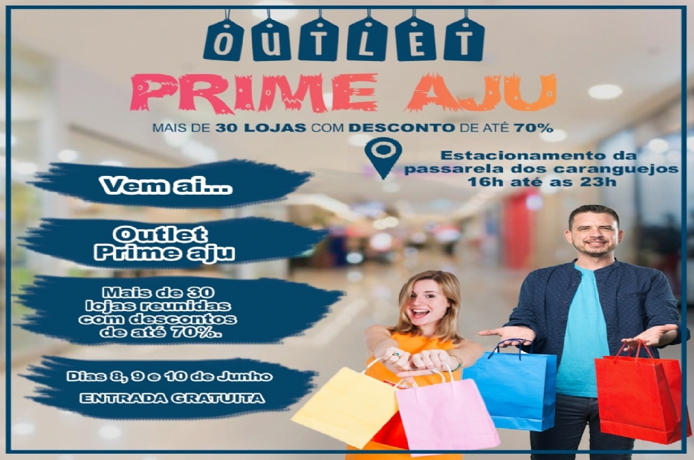 A Primeira edição do Outlet Prime Aju acontece nos dias 8,9 e 10 de junho, das 16h as 23hrs, no Estacionamento da Passarela do Caranguejo (Cinelândia). O evento visa movimentar a economia do Estado, reunindo empresas dos seguimentos de moda, beleza e gourmet para vender os seus produtos a preços promocionais.