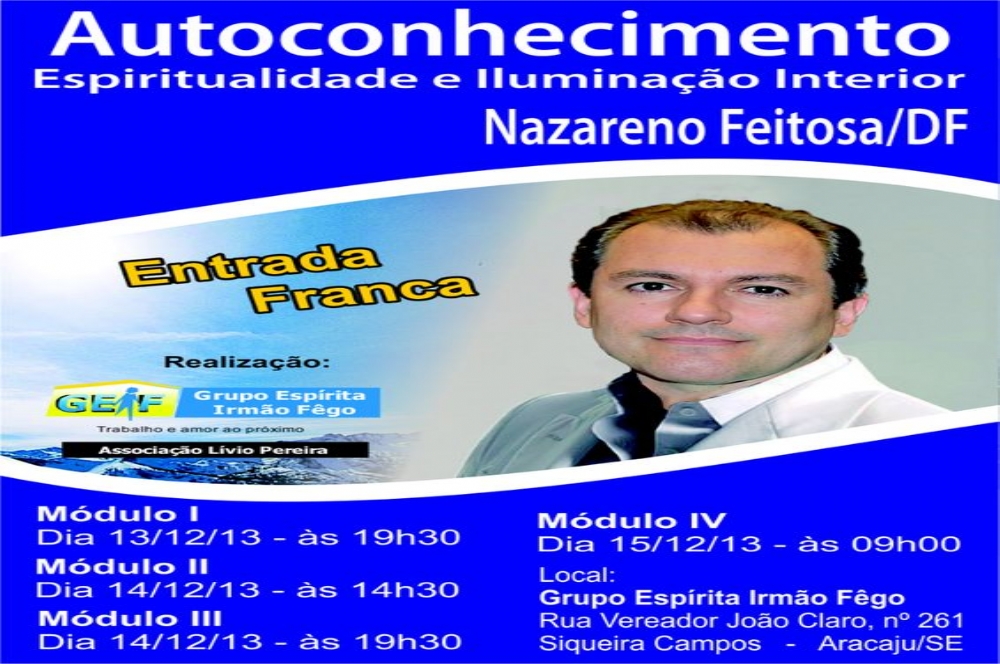 O evento é uma realização do Grupo Espírita Irmão Fêgo e Associação Lívio Pereira. Nazareno Feitosa/DF ministrará o evento que acontece em quatro módulos. A entrada é franca e as palestras acontecem quatro módulos: no dia 13, a partir das 19h30; no dia 14, às 14h30 e 19h30; e no dia 15, a partir de 9h.