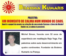 “Um momento de calma num mundo de caos. Qual é o papel da mente na criação de um estado sereno e livre do medo? Cuide-se, a calma é possível”. Esse é o tema da palestra realizada no dia 16 de julho pelo francês Michael Simon, fundador da Brahma Kumaris na França e atual diretor dessa instituição na Sérvia.