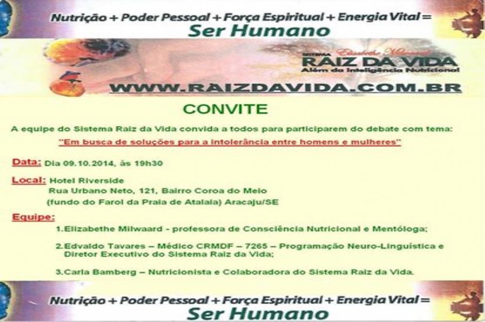 A equipe do Sistema Raiz da Vida convida a todos para o debate “Em busca de soluções para a intolerância entre homens e mulheres”, que será realizada no dia 9 de outubro, a partir das 19h30, no Hotel Riverside, localizado na rua Urbano Neto, bairro Coroa do Meio.