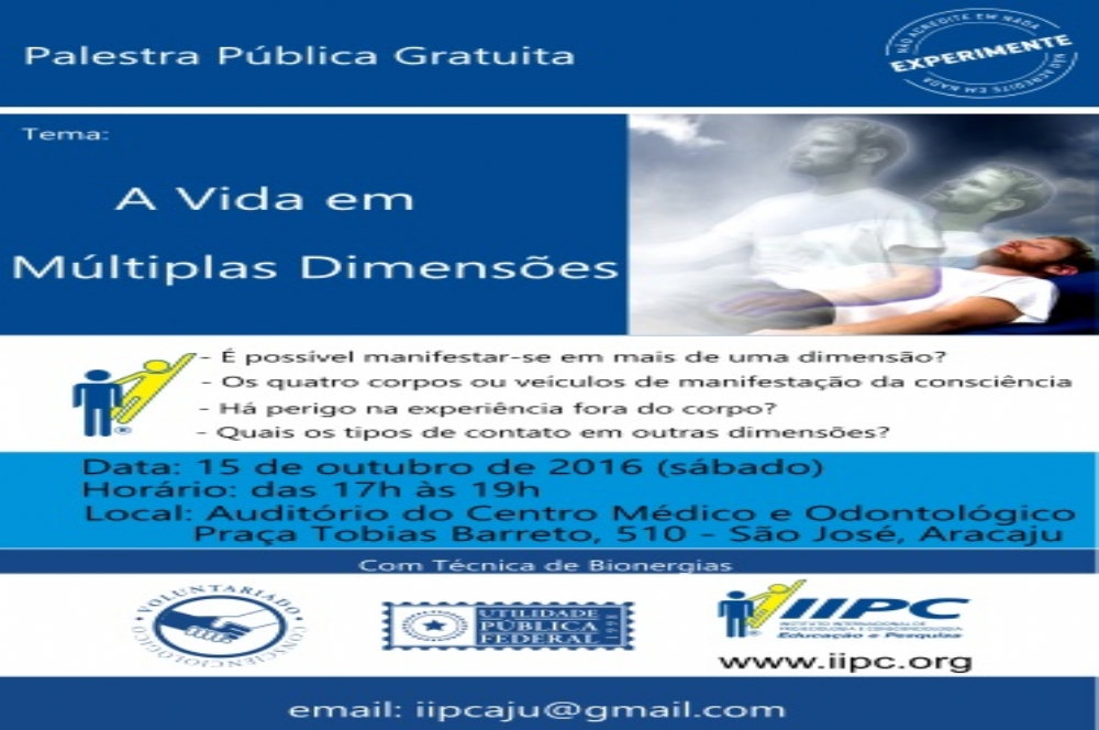 O Instituto Internacional de Projeciologia e Conscienciologia (IIPC) estará realizando, no dia 15 de outubro, uma palestra gratuita que terá como tema a multidimensionalidade da consciência. O IIPC é uma instituição de Educação e Pesquisa Científica, pacifista, laica, universalista, sem fins de lucro, não doutrinária, independente, que se destaca pela excelência em cursos e publicações técnico-científicas sobre as ciências Projeciologia e Conscienciologia.