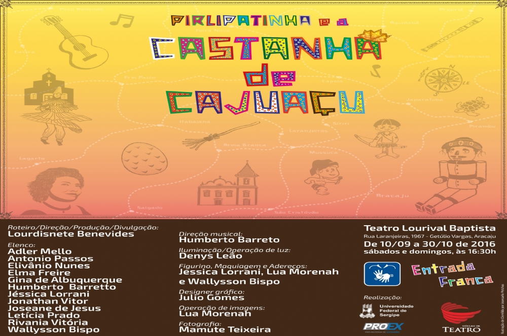 Até que a princesinha, tomada de amor e gratidão por Miguel, beija-o e o feitiço que o atingiria é também quebrado. Todos ficam muito felizes com o desenrolar dos acontecimentos. Mas, aqui nessa história, os personagens não se casam e vivem felizes para sempre. Ao contrário, eles revelam um discurso inclusivo e provocam muitas reflexões contemporâneas. PIRLIPATINHA E A CASTANHA DE CAJUAÇU é um espetáculo teatral com enfoque na ludicidade dos processos artísticos e pedagógicos e na formação da cultura sergipana.