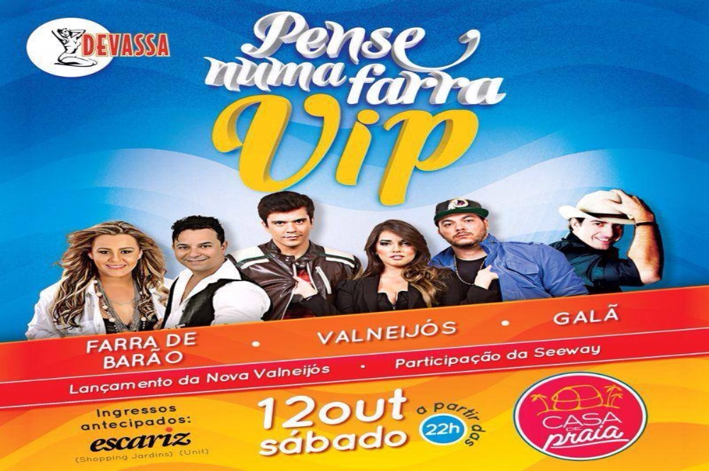 “Pense em uma Farra VIP” acontecerá no dia 12 de outubro, a partir das 22h, na Casa de Praia. Essa será a farra para reunir os amigos em uma noite que contará com uma mistura de vários ritmos. A festa será comandada por Galã, Valneijós, Farra de Barão e terá a participação de Seeway.