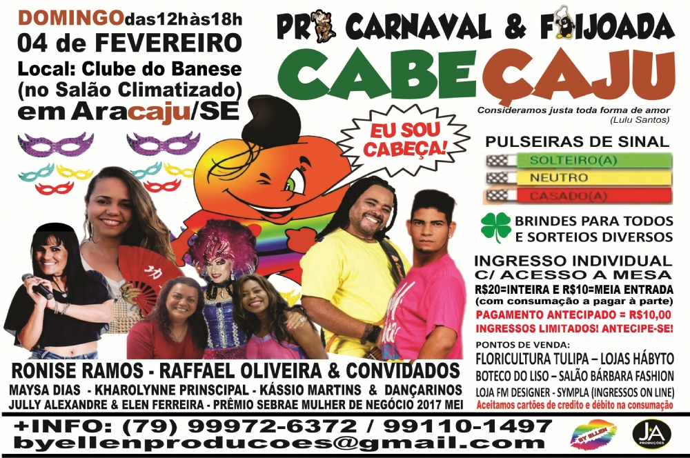 No domingo, dia 4 de fevereiro, das 12h às 18h, Aracaju será palco de mais uma edição do Pré Carnaval & Feijoada Cabeçaju. A festa será comandada pelo talento de Ronise Ramos e Raffael Oliveira, trazendo outros convidados especiais. O evento terá ainda a participação da cantora Maysa Dias lançando seu segundo CD, da Drag Queen Kharolynne Prinscipal animando os diversos sorteios e do showman da zumba, Kássio Martins e sua turma de dança, agitando a galera com suas coreografias.
