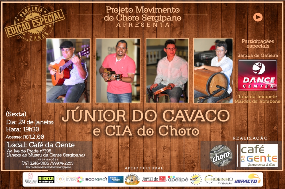 Nessa sexta (29) de janeiro estaremos dando o pontapé inicial a temporada 2016 na oportunidade iremos celebra os 02 anos de parceria do projeto com o Café da Gente. O show desse primeiro momento ficara por conta de Jr do Cavaco & Cia do Choro e