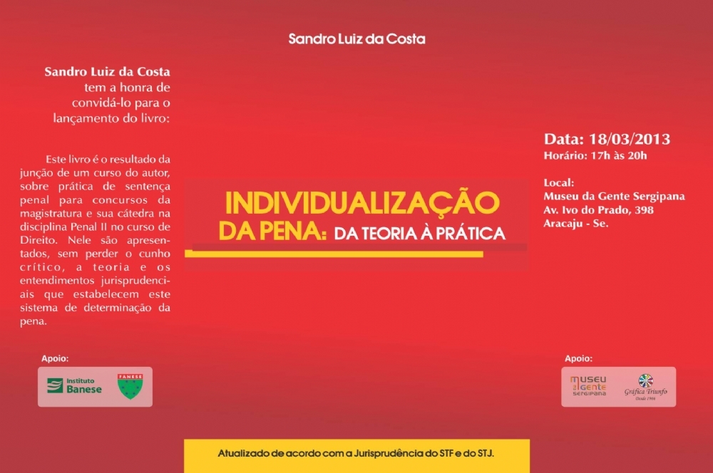 Será realizado no próximo dia 18 de março o lançamento do livro “Individualização da Pena: Da Teoria à Prática” do promotor Sandro Luiz da Costa. A solenidade ocorrerá das 17h às 20h no Museu da Gente Sergipana, na avenida Ivo do Prado, nº 398.