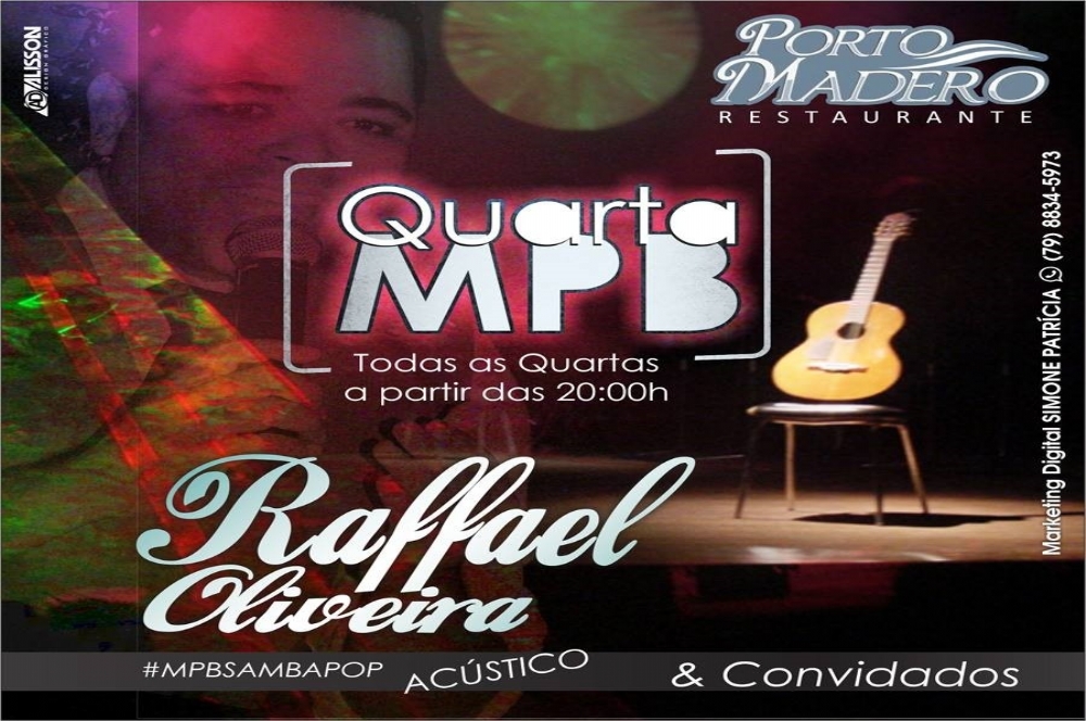 Nesta quarta-feira, 21, o cantor carioca radicado em Aracaju, Raffael Oliveira, estreia a Quarta MPB. Os convidados da 1ª edição são os cantores Igor Rodsi e Torugo Teles. O evento acontece a partir das 20h, no Restaurante Porto Madeiro (avenida Santos Dumont, 650, Orla de Atalaia).