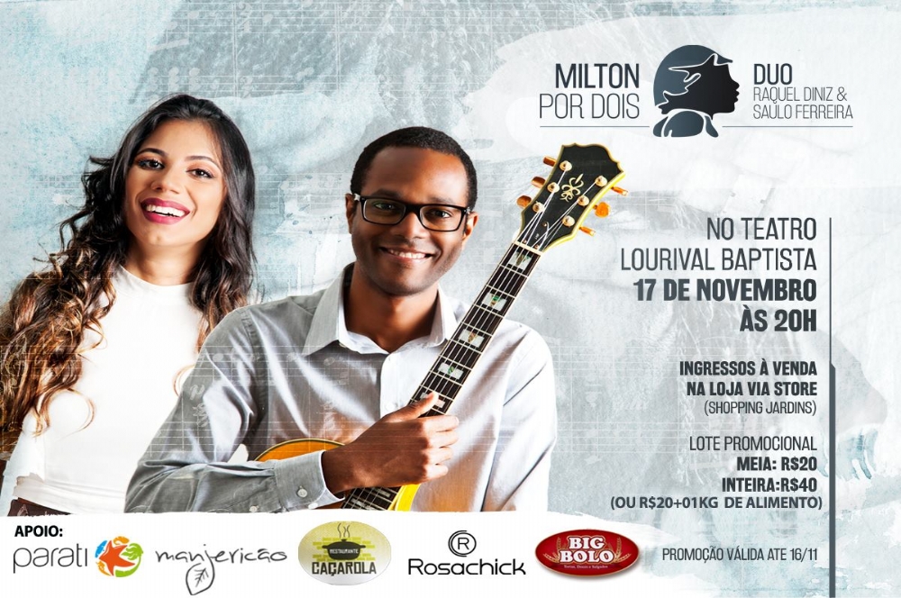 Com o intuito de apresentar releituras das principais obras compostas por um dos maiores ícones da música brasileira, Milton Nascimento, os músicos sergipanos Saulo Ferreira (cordas) e Raquel Diniz (voz) apresentam o espetáculo “Milton por Dois”, quinta-feira, 17, às 20h, no Teatro Lourival Baptista.