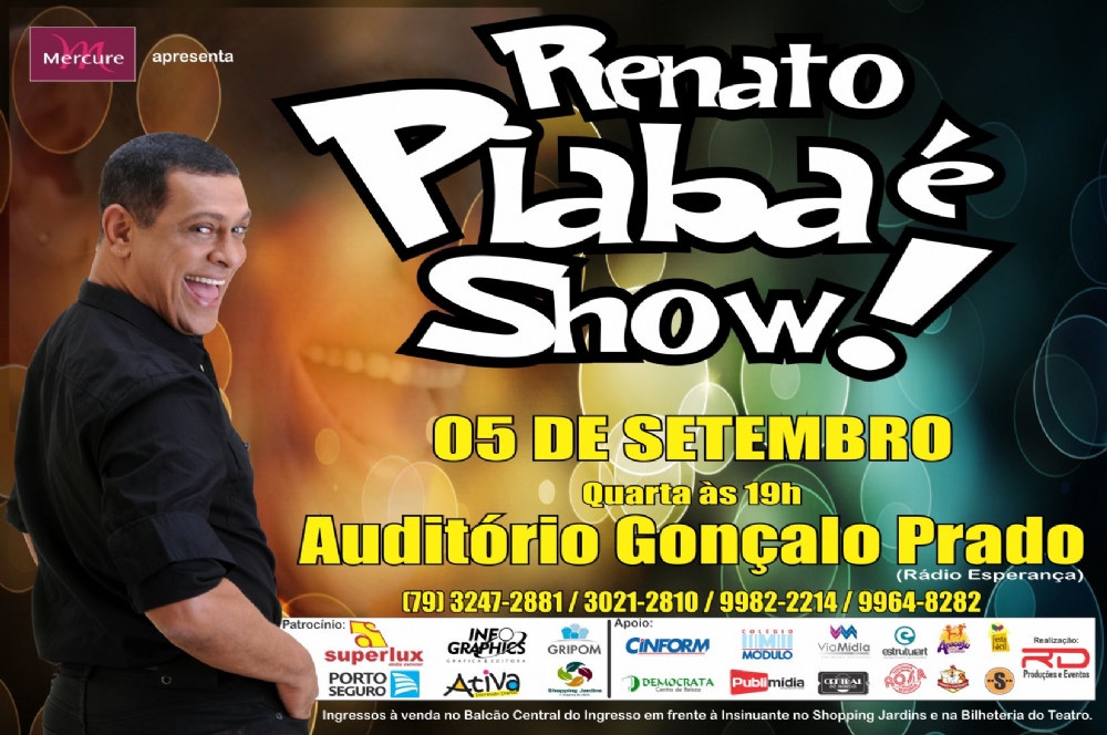 Após 17 anos de carreira e 17 espetáculos consagrados, Renato Piaba inova mais uma vez e traz o espetáculo ‘Renato Piaba é Show’, mostrando o que há de melhor para o deleite dos seus fãs. O comediante, que se apresenta em Aracaju nos dias 7, 8 e 9 de setembro, e em Estância no dia 5 do próximo mês, trará para o Estado um pout-pourri dos seus melhores causos.