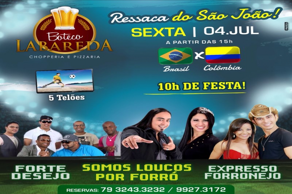 Nesta sexta-feira, 4, tem jogaço entre Brasil e Colômbia e Ressaca do São João no Boteco Labareda. A casa estará aberta a partir das 15h com cinco telões para a exibição da partida. Para completar a festa, o Boteco Labareda traz o Grupo Forte Desejo que fará um sambinha antes e no intervalo do jogo da Seleção Brasileira.