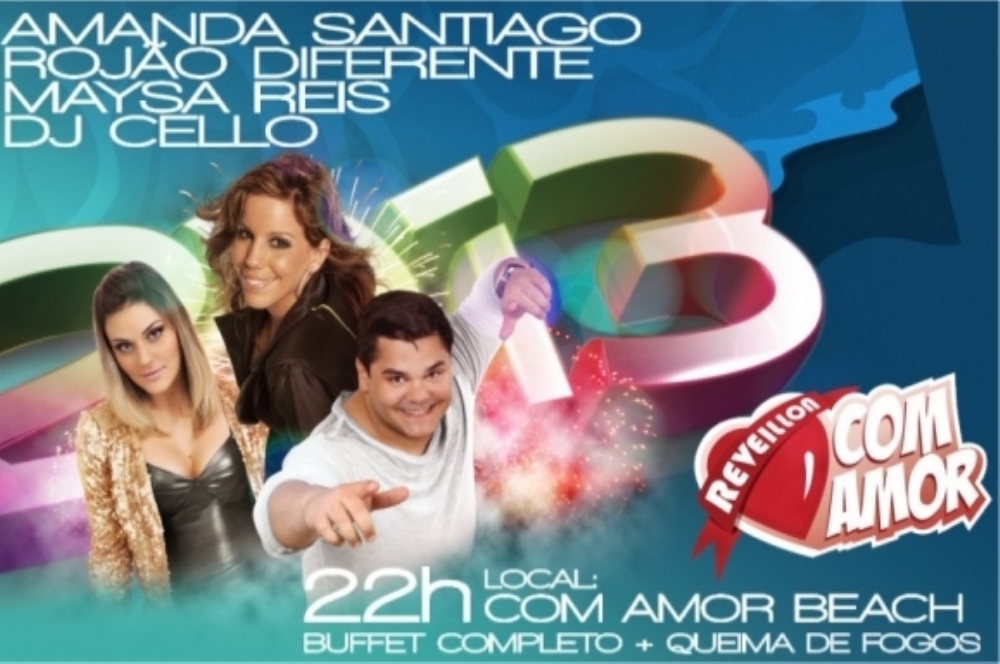 O Reveillon 2013 do Com Amor Beach Bar trará nesta edição Amanda Santiago (Ex-Timbalada), Maysa Reis, a banda Rojão Diferente e ainda os hits animados do DJ Cello. A festa será realizada a partir das 22h, na areia da praia do Refúgio, Rod. José Sarney, em um Reveillon feito com muito amor e satisfação. O evento contará com Buffet escolhido por David Brito, Show Pirotécnico e Decoração Exclusiva.