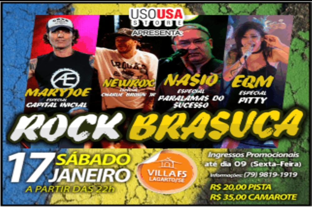 No dia 17 de janeiro, o Villa F5, em Lagarto, recebe a primeira edição do Rock Brasuca. O projeto pretende o levar o rock nacional representado através das melhores bandas do Nordeste. Quem dá início ao projeto são as bandas Maryjoe (Capital Inicial), EQM (Pitty), Nasio (Paralamas do Sucesso) e Newroox (Charlie Brown). A noite promete movimentar o interior sergipano. Participe da promoção do Portal Infonet e concorra a ingresso.