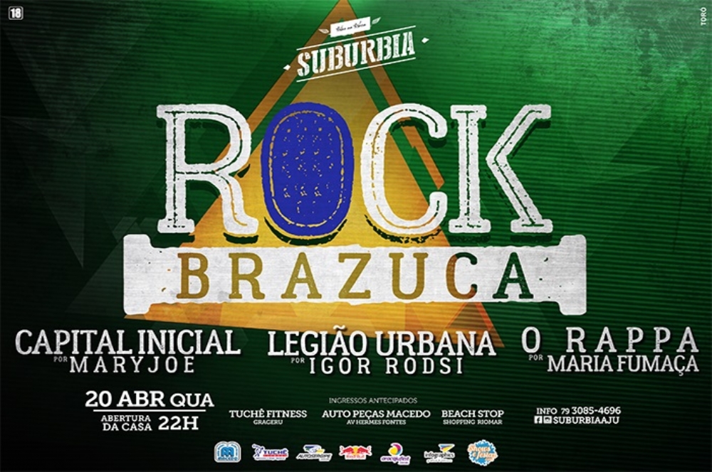 Uma homenagem as grandes bandas do cenário nacional. Assim vai ser o Rock Brazuca, que acontece no dia 20 de abril, véspera de feriado, no Suburbia. Com MaryJoe interpretando os sucessos da Capital Inicial, Igor Rodsi fazendo a Legião Urbana e Maria Fumaça cantando O Rappa, será uma noite com o melhor do rock brasileiro a partir das 22 horas.