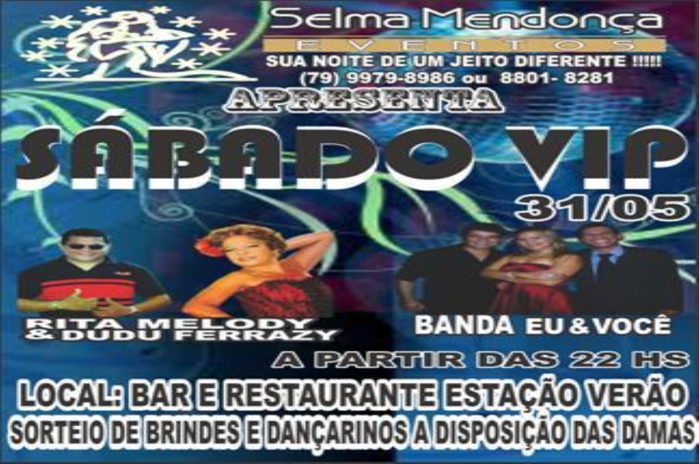A dupla Rita Melody & Dudu Ferrazy e a banda Eu e Você são as atrações do Sábado Vip que acontece no dia 31, a partir das 22h, no bar Estação Verão. Haverá sorteio de brindes e dançarinos à disposição das damas. Informações através do telefone (79) 9979 8986 e 8801 8281.