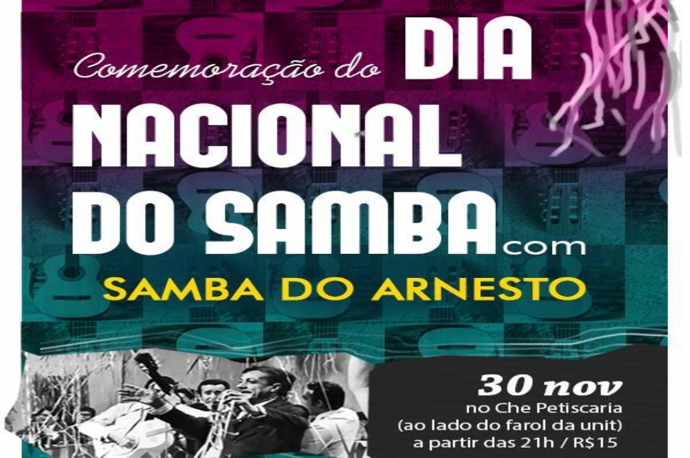 Samba do Arnesto comemora "Dia Nacional do Samba" acontecerá no dia 30/11, às 21h no bar CHE (próximo ao farol da Farolândia), por apenas 15 reais.