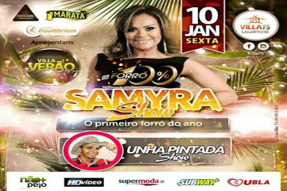 Na próxima sexta-feira, 10, Samyra Show e forró 100% fará seu show na boate Villa F5 localizada no município de Lagarto. A banda Unha Pintada também fará participação. Ingressos a venda no local por R$ 30.