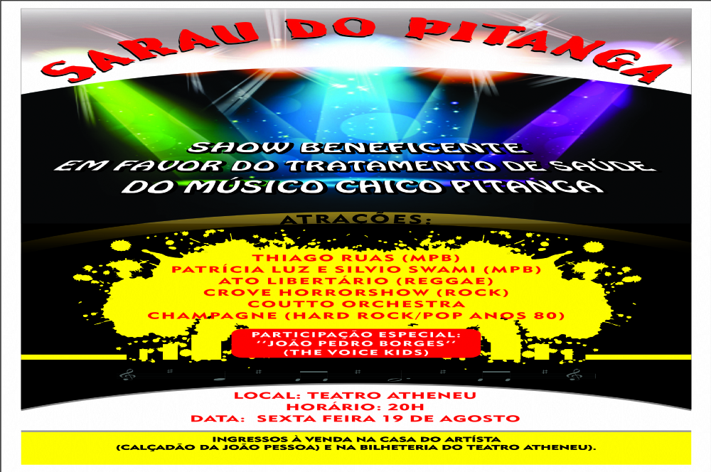 O Teatro Atheneu recebe nesta sexta-feira, 19 de agosto, a partir das 20h, o Sarau do Pitanga, um evento beneficente em prol do músico Francisco Vicente Pitanga (Chico Pitanga), que vem enfren-tando um tratamento contra um tumor cerebral.
