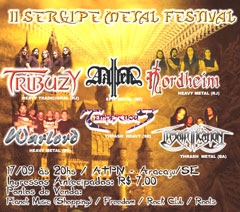 As atrações são: Tribuzy, considerada uma das maiores revelações do heavy metal nacional; Nordheim, grupo tradicional e oitentista; Insaintification, banda de trash/death metal; a veterana Warlord, considerada a melhor banda – do estilo – no Estado; Tempestuos e Akkalabeth, grupos formados em 2003 e 2001, respectivamente. II SERGIPE METAL FESTIVAL Com as bandas Tribuzy, Nordeheim, Insaintification, Warlord, Tempestuos e Akkalabeth. * Dia: 17/Set. (Sab) * Pontos de venda: Planet Music (Shopping), Freedom, Rock Club e Roots