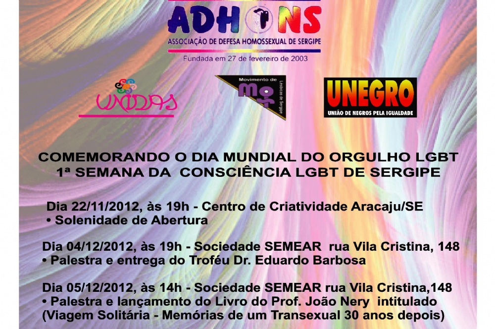 Em comemoração ao Dia Mundial do Orgulho LGBT, a Associação de Defesa Homossexual de Sergipe (Adhons) promoverá a 1ª Semana da Consciência LGBT de Sergipe. Os eventos acontecem nos dias 22 de novembro e 4 e 5 de dezembro.