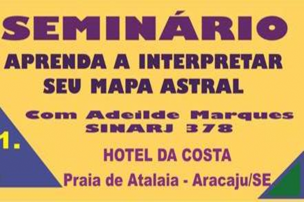 O Seminário "Aprenda a Interpretar seu Mapa Astral" acontece nos dias 8 e 9 de novembro, no Hotel da Costa, Praia de Atalaia. Informações e inscrições através do email ademarcques@yahoo.com.br e dos telefones (79) 3255 2221 / 9148 0340.