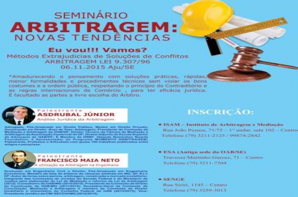 O seminário ‘Arbitragem: novas tendências’ tem o objetivo de ajudar na resolução de conflitos, desafogando o Poder Judiciário. Entre os palestrantes, Asdrubal Júnior e Francisco Maia Neto. O evento é organizado pela Ordem dos Advogados do Brasil (OAB/SE) e acontece nesta sexta-feira, 6, das 8h30 às 12h, no hotel Quality, em Aracaju.
