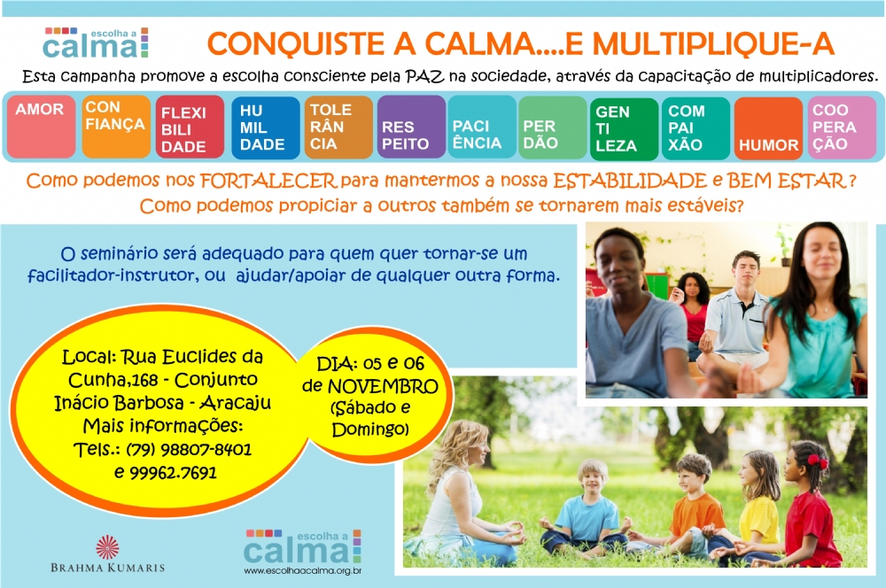 O Seminário Conquiste a Calma acontece nos dias 5 e 6 de novembro, no Núcleo de Meditação Raja Yoga. O evento é destinado a quem deseja se tornar um facilitador-instrutor.