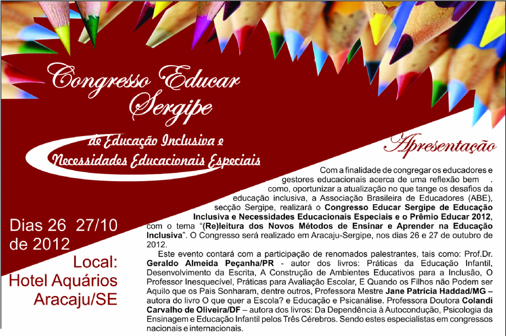 Com a finalidade de congregar os educadores e gestores educacionais e de oportunizar a atualização a respeito dos desafios da educação inclusiva, a Associação Brasileira de Educadores (ABE), secção Sergipe, realizará o Congresso Educar Sergipe de Educação Inclusiva e Necessidades Educacionais Especiais, além do Prêmio Educar 2012. O congresso terá como tema (Re)leitura dos Novos Métodos de Ensinar e Aprender na Educação Inclusiva, e será realizado nos dias 26 e 27 de outubro, no hotel Aquarios.