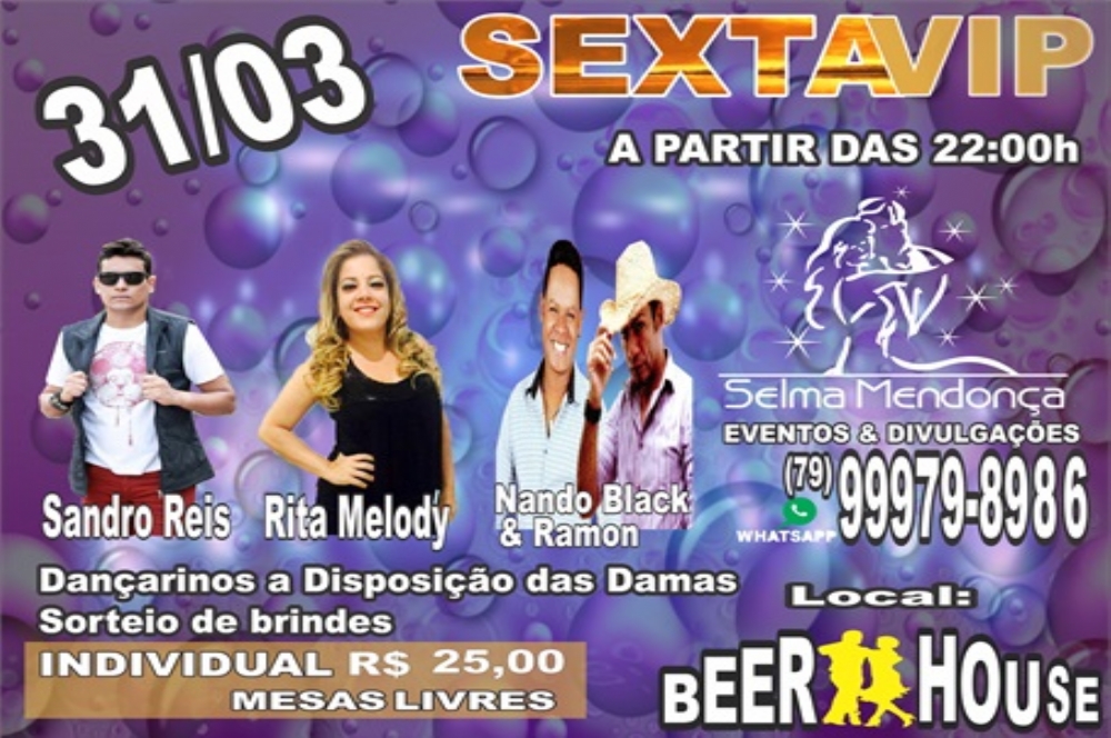 A Selma Mendonça Eventos realizará o Evento "Sexta Vip" na Casa de Shows e Restaurante Beer House. O evento ocorrerá no dia 31 de março, às 22h, e contará com as atrações Sandro Reis, Rita Melody e Nando Black e Ramon, além de sorteio de brindes e dançarinos à disposição das damas.
