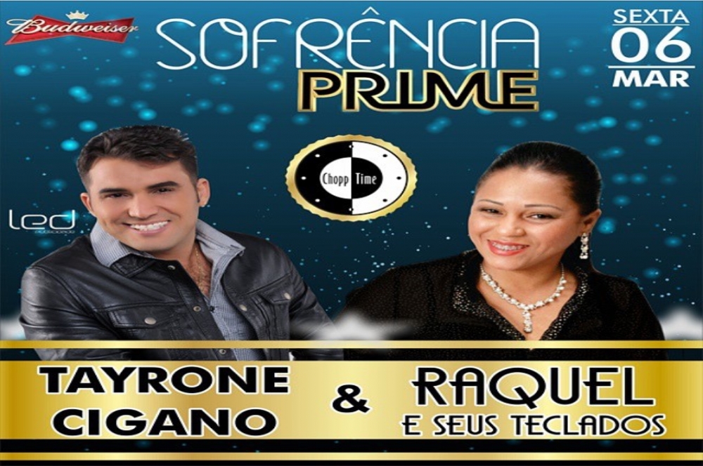 Raquel e seus Teclados e Tayrone Cigano são as atrações do Sofrência Prime que acontece no dia 6 de março, a partir das 22h, no Chopp Time.