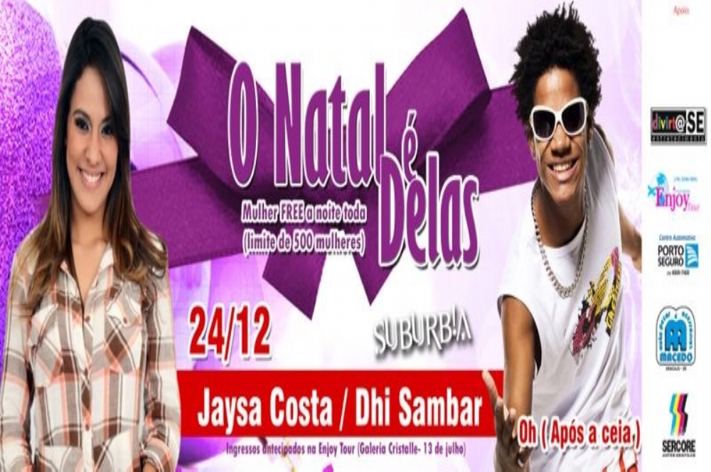 Para animar a madrugada do Natal, o Suburbia traz, a partir da meia noite do dia 25, a cantora Jaysa Costa e a banda Dhi Sambar. Jaysa, que participou do ídolos e agora é sucesso no mercado musical do arrocha universitário, fará uma noite inesquecível junto com a banda Dhi Sambar, que apresenta um pagode e samba com estilo diferenciado, e canta a música 'pole dance' que é sucesso no verão.