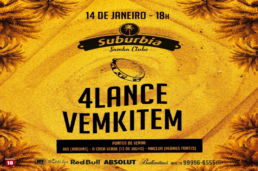 O Suburbia Samba Clube está de volta e neste domingo, 14 de janeiro, terá como atrações as bandas Vemkitem e 4Lance. O evento inicia no final da tarde de domingo, às 18 horas, com duas bandas que prometem um repertório diversificado com o melhor do samba.